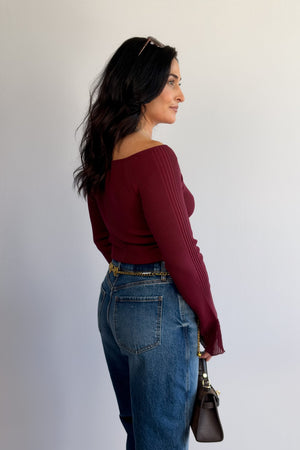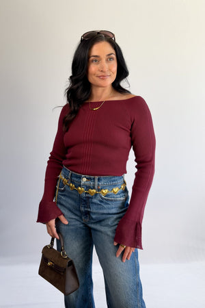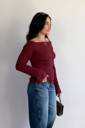Feminine, sleek, and incredibly versatile. Our Ballet Neck Ribbed Knit Top skims the body with soft stretch ribbing and a wide, graceful neckline that can be styled slightly off-shoulder. Long sleeves finish in a delicate fluted cuff for subtle movement. Wear it with denim for daytime or with a slip skirt and heels for date night—the rich wine red hue makes everything look elevated.
