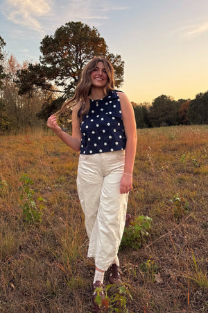 The Women’s Navy Polka Dot Sleeveless Top fits true to size to slightly big. The fabric is very soft, lightweight and does not stretch. The fit is boxy and playful and perfect to pair with your favorite bottoms. The model is wearing size small. Refer to the measurements below and choose your perfect fit.