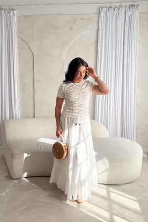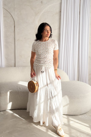 Soft, feminine, and effortlessly wearable, this pointelle floral short sleeve top is a spring staple designed for everyday ease. Crafted in a lightweight pointelle knit, it features delicate blush pink floral details scattered across a crisp white base for a clean, romantic look.