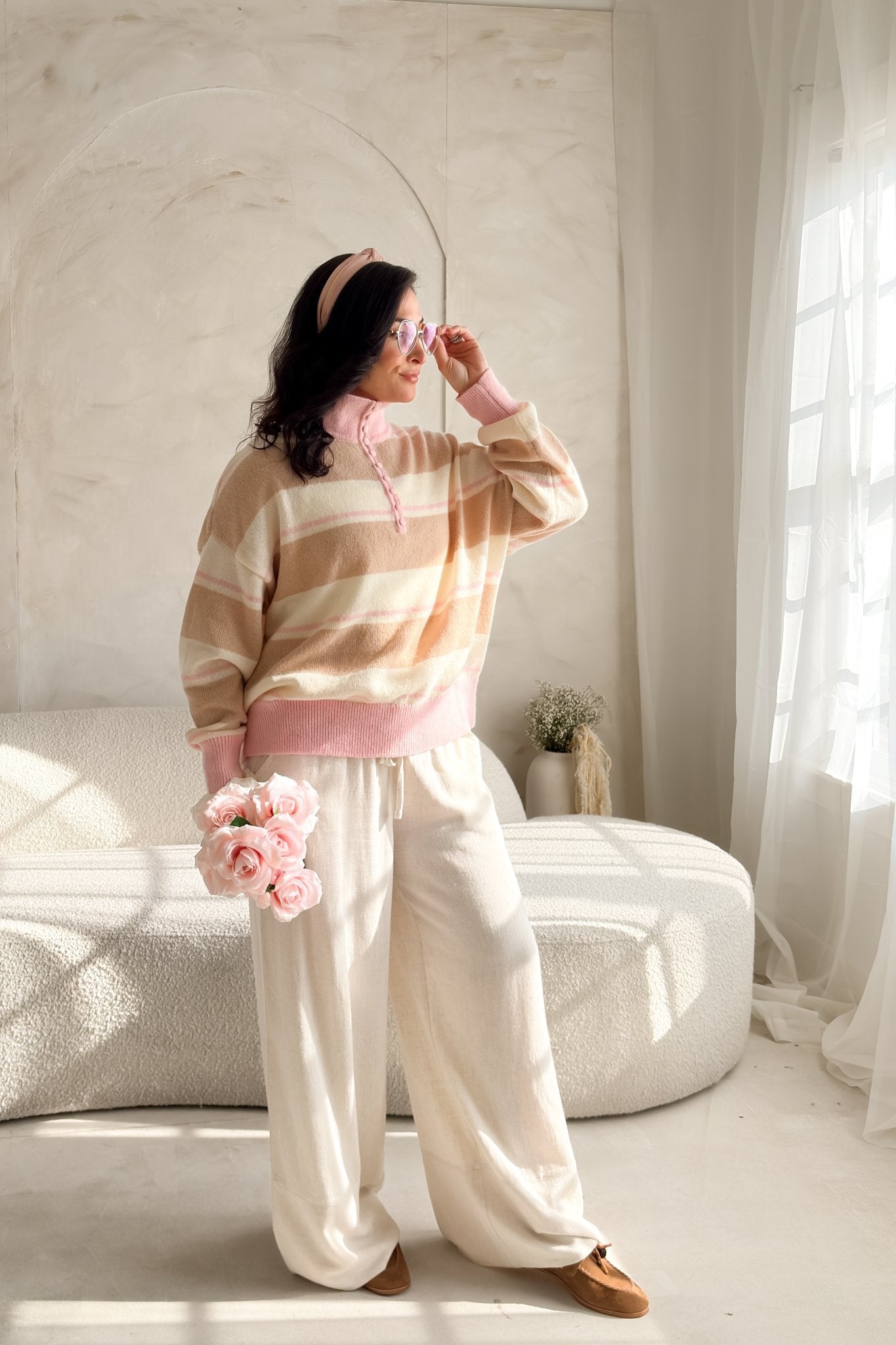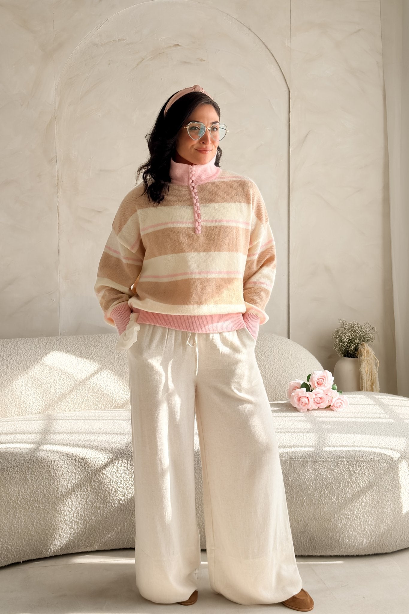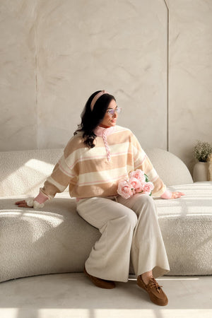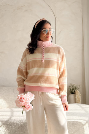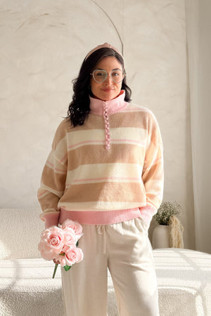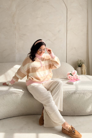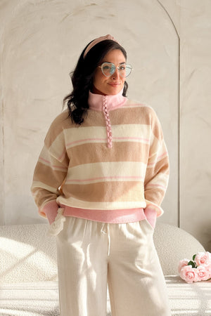 This lightweight striped sweater blends creamy neutrals with soft blush tones for that easy, romantic feel you love. The knit is breathable and airy, making it perfect for transitional weather, layering, or wearing on its own when you want to look polished without trying too hard.