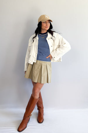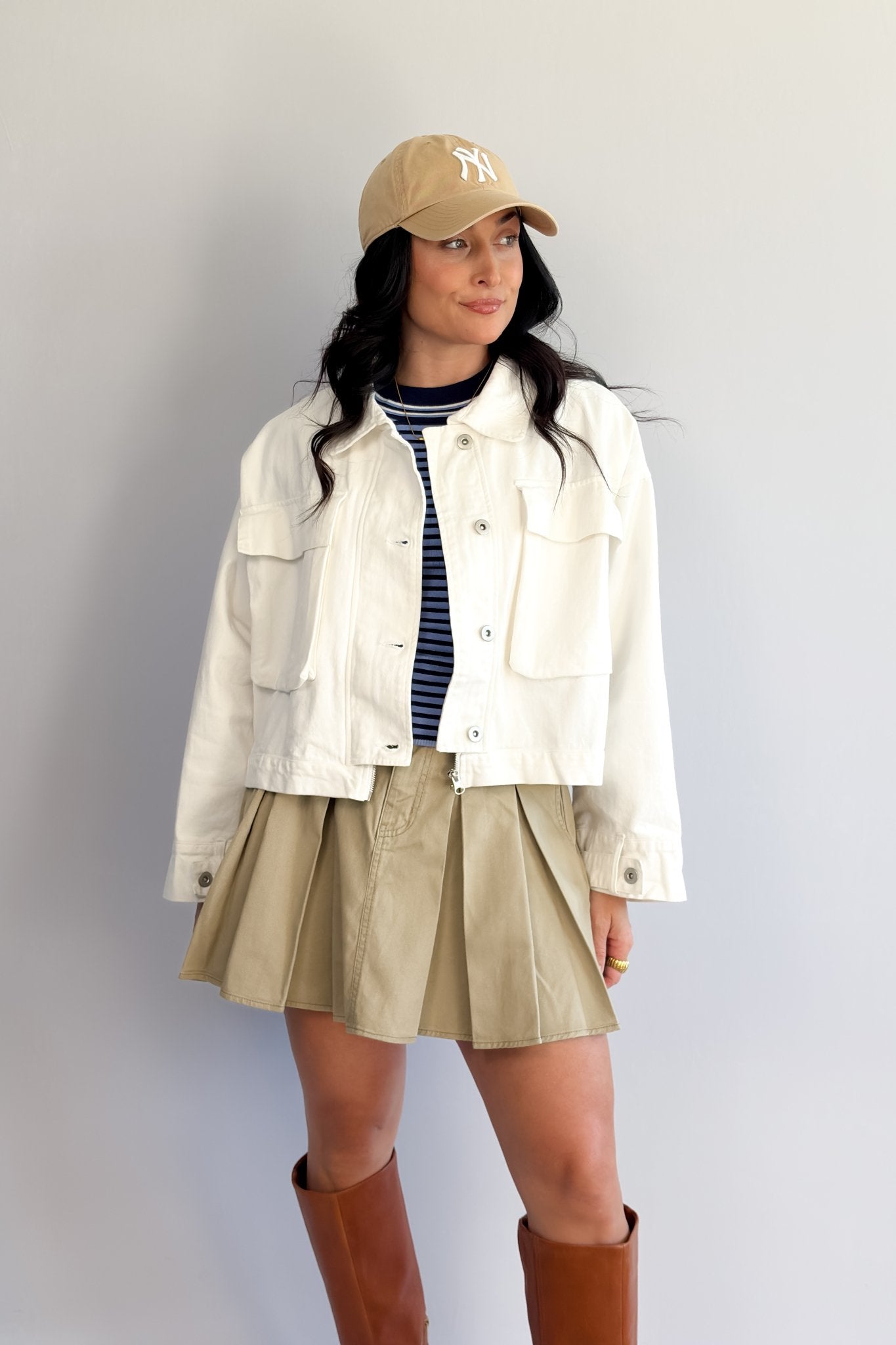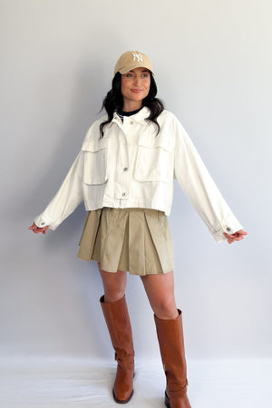 Meet the layer you’ll reach for year-round. This cropped utility jacket in soft ivory twill blends a modern, boxy fit with timeless workwear details—oversized flap pockets, a collared neckline, zipper and snap-front closure. The slightly cropped length hits right at the waist to balance high-rise denim, tailored trousers, or pleated minis. Lightly structured yet easy to move in, it’s the throw-on piece that pulls every outfit together—from Saturday errands to dinner plans.