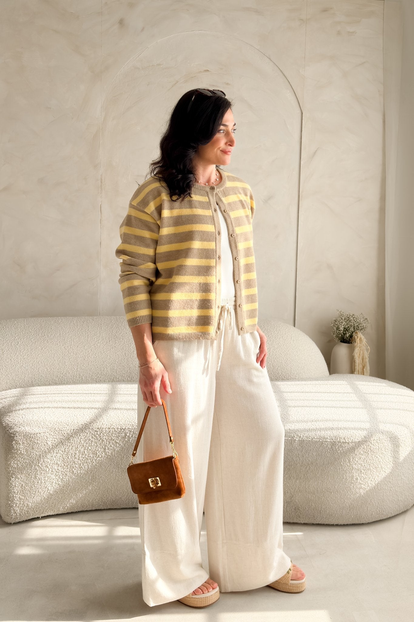 Soft taupe and butter yellow stripes create that warm, sunlit tone that instantly brightens your outfit without overpowering it. The fit is relaxed but polished, making it easy to layer over a simple tank, tee, or even a collared shirt for that elevated everyday look.