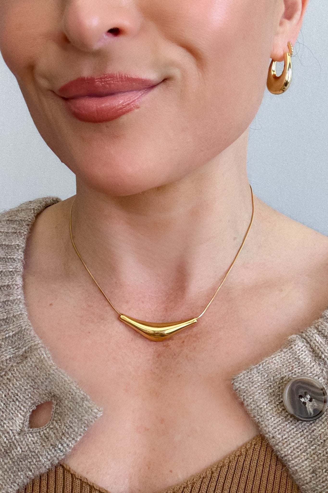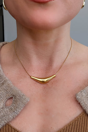 Meet your new everyday layer. This sculptural curved-bar necklace sits gracefully at the collarbone for a clean, minimal look that elevates tees, knits, and evening outfits alike. Crafted with durable 18K gold plating over a tarnish-resistant base, it stays shiny through busy days and nights. Lightweight, hypoallergenic, and made for stacking—wear it solo for a sleek finish or pair with your favorite chains.