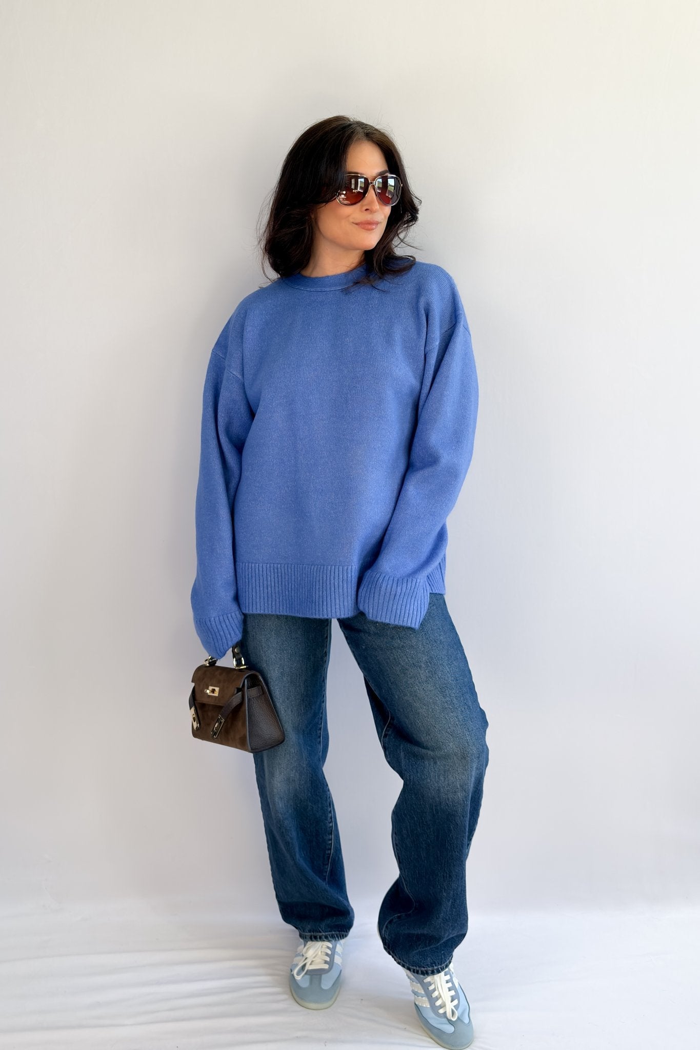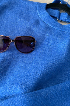 The Women’s Open-Back Sweater in Cobalt Blue fits oversized. The knit is made of a very soft stretch fiber that is not itchy. The fit is boxy and generous in the body and sleeves. You can easily layer a fitted white tee under the sweater for added coverage and warmth. The model is wearing size medium.