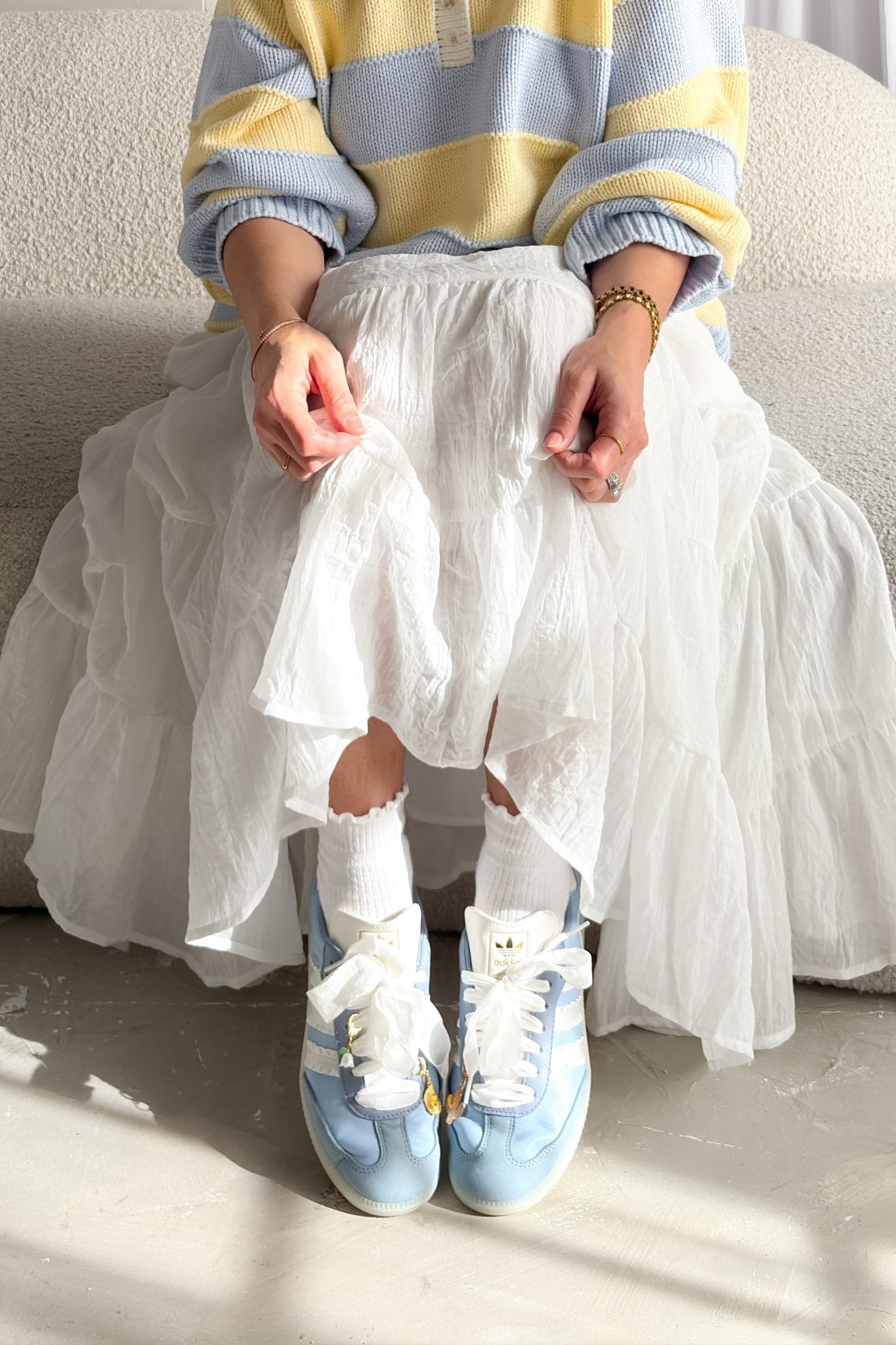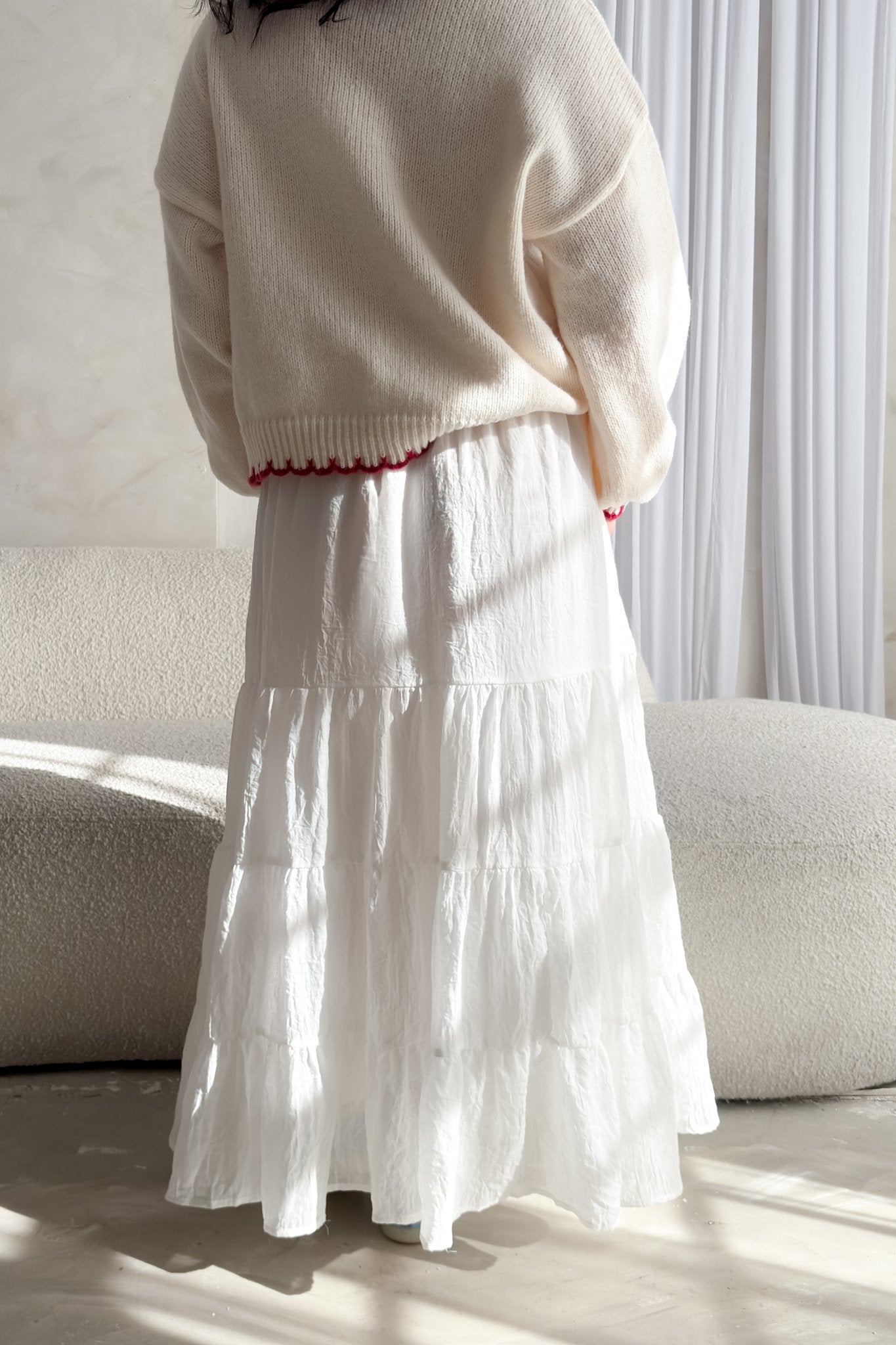 This white crinkle tiered maxi skirt features a lightweight, airy fabric with a natural textured finish that is intentionally anti-wrinkle for easy everyday wear. Designed with a relaxed silhouette and full lining, it offers comfortable coverage while maintaining a soft, flowy feel.