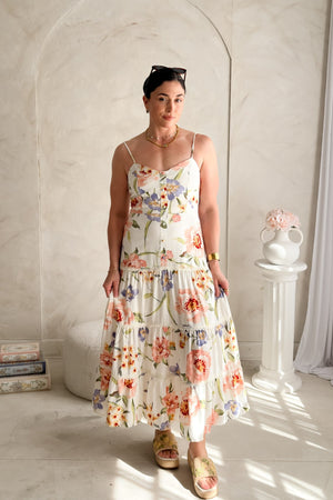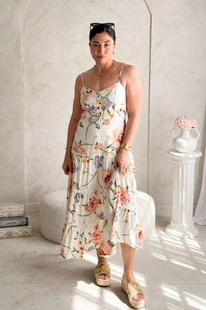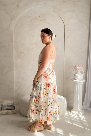 This floral midi dress for summer features a lightweight feel with a soft drape that moves beautifully with you. The fitted bodice creates a flattering shape, while the tiered skirt adds flow and dimension for an effortlessly elevated look.