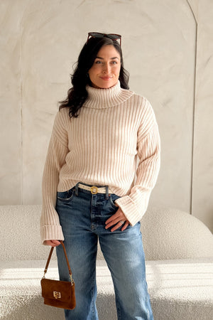 The Weekend LA Merino Wool Ribbed Turtleneck Sweater fits true to size with a relaxed and boxy body. The length is perfect for a half tuck and high waist denim. The turtleneck is relaxed and shapeable. The merino wool blend is very soft with stretch. The sleeve measurement does not account for the drop shoulder, only the sleeve. The model is wearing size small.