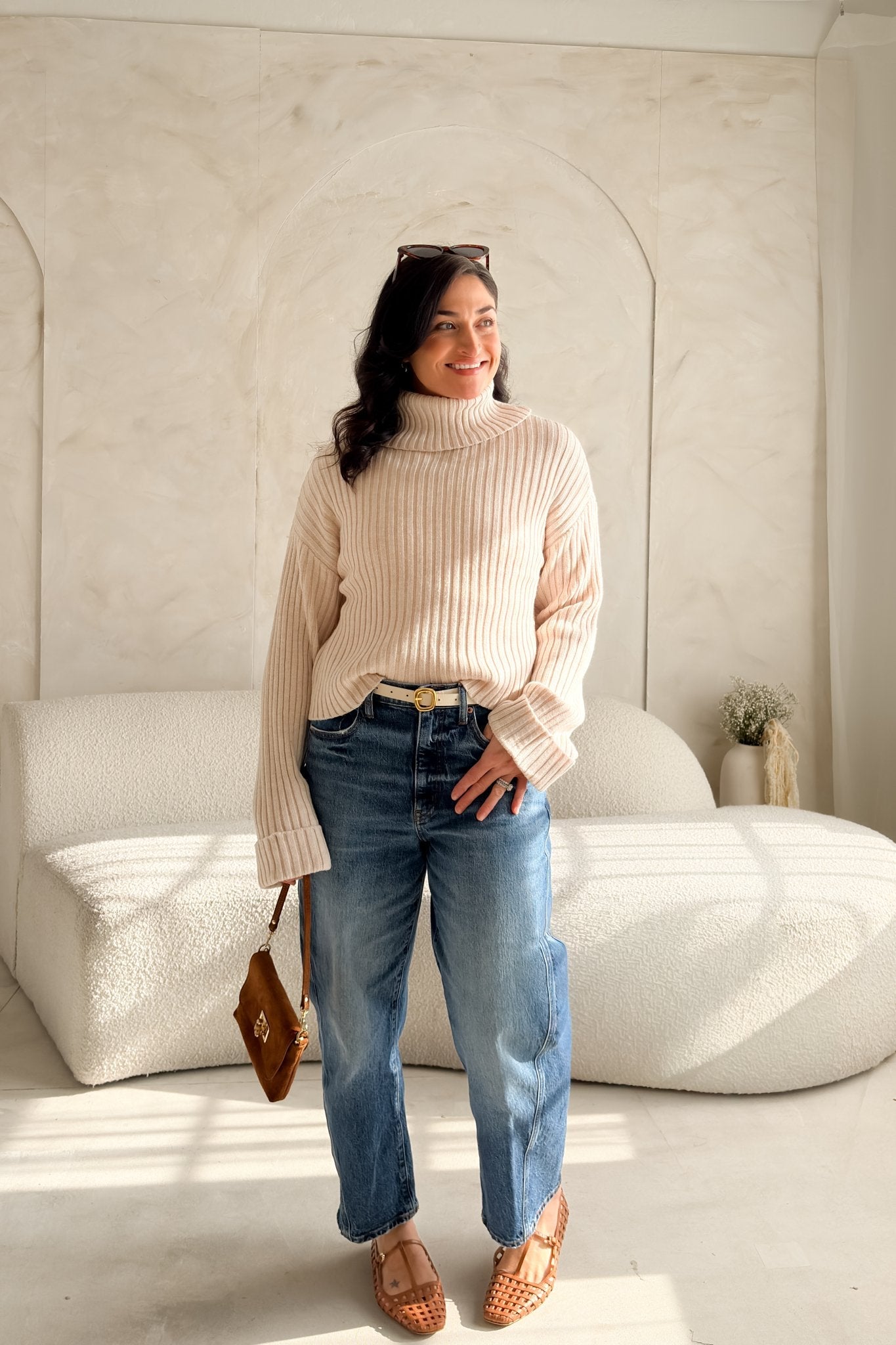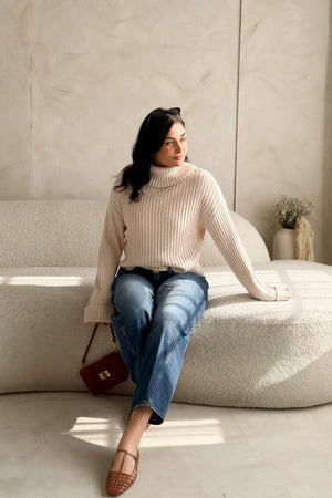 The relaxed silhouette drapes effortlessly, while the vertical ribbing adds subtle texture and a flattering, elongating effect. The shape-able turtleneck is intentionally flexible — fold it over, scrunch it softly, or wear it loose depending on your mood and styling.