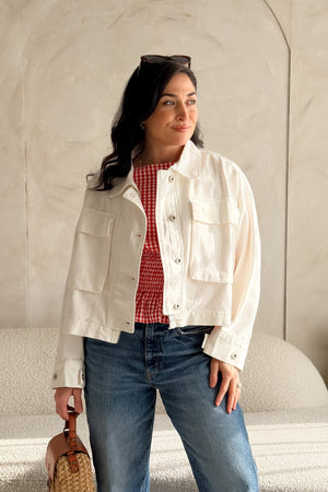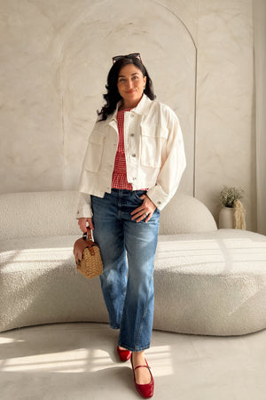 A crisp white utility jacket made from breathable cotton with an oversized, relaxed silhouette that feels effortless yet polished. Designed with a structured shape that still moves easily, this jacket is the kind of layer you’ll reach for again and again—perfect for casual days, travel, or elevating everyday denim.
