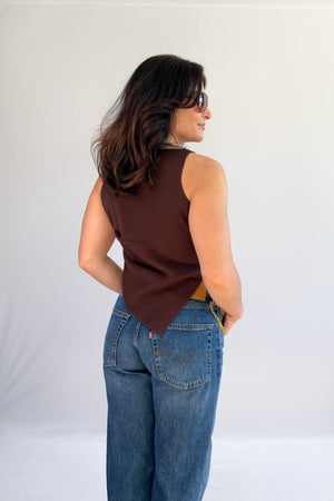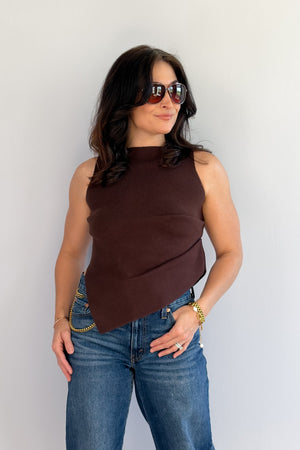 Polished meets modern. This chocolate brown sleeveless knit top pairs a clean mock neck with a sculpted, asymmetrical handkerchief hem that frames the waist and flatters every angle. The mid-weight sweater knit is soft with comfortable stretch, so it holds shape without clinging. Dress it up with tailored trousers and heels, or keep it effortless with vintage denim and flats—either way, it’s that rich, capsule-worthy layer you’ll reach for on repeat.