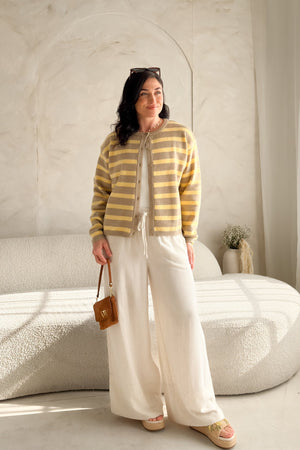 Soft taupe and butter yellow stripes create that warm, sunlit tone that instantly brightens your outfit without overpowering it. The fit is relaxed but polished, making it easy to layer over a simple tank, tee, or even a collared shirt for that elevated everyday look.